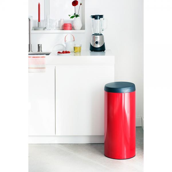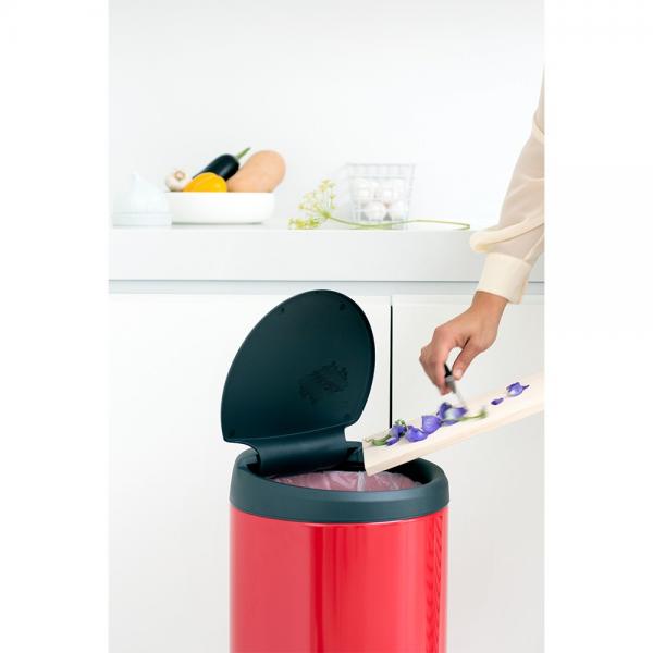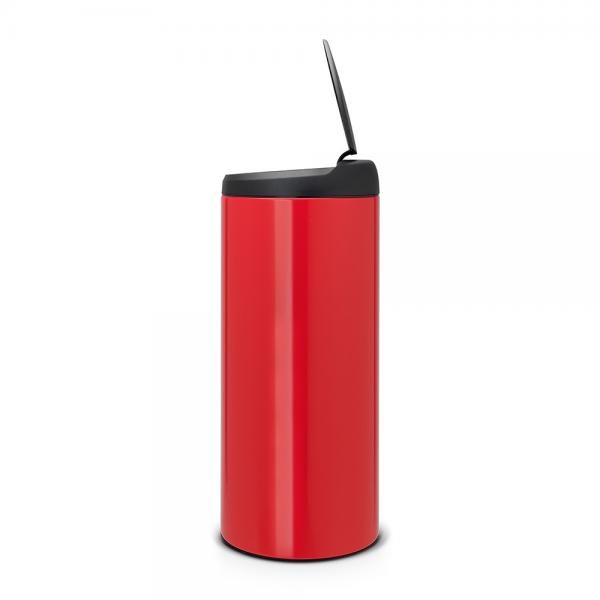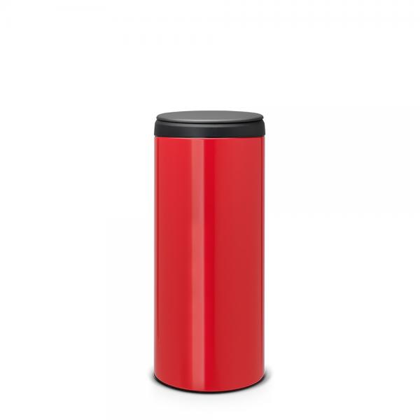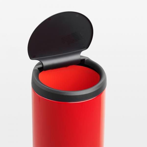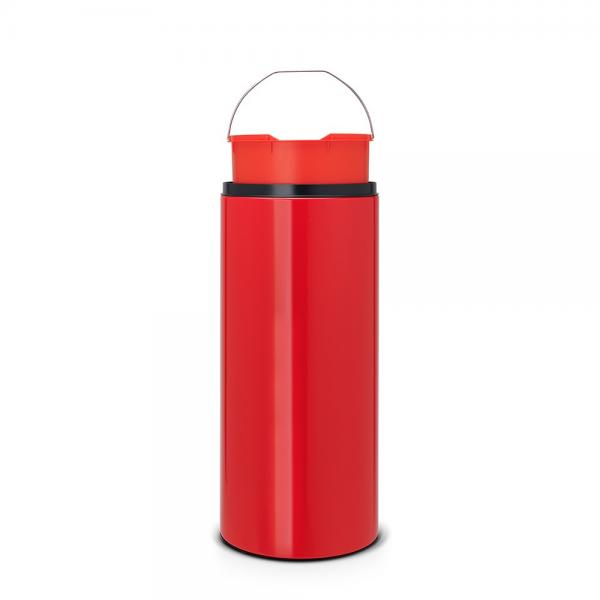 Czerwony lakierowany proszkowo, 30 litrowy kosz typu 'FlipBin' posiada szczelną pokrywę z wysokiej jakości tworzywa, która zapobiega przedostawaniu się zapachów na zewnątrz kosza Wewnątrz znajduje się plastikowy czerwony pojemnik, który można swobodnie wyjąć, ponadto posiada otwory, które zapobiegają efektowi zasysania pełnego worka, przy jego wymianie.