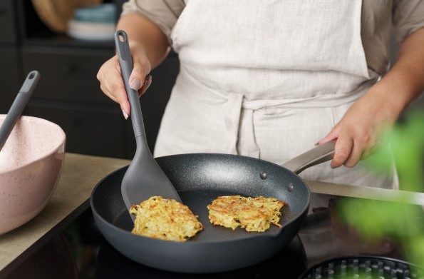 Jej skośna, nylonowa głownica pozwala na łatwe i precyzyjne podważanie oraz przewracanie potraw, bez ryzyka uszkodzenia delikatnych powłok naczynia.