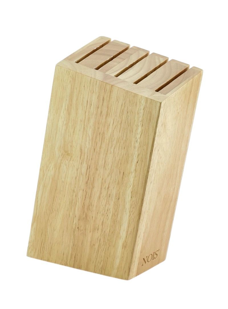 Drewniany blok dołączony do zestawu pozwala przechowywać noże w bezpieczny sposób, chroniąc ostrza przed stępieniem i porządkując przestrzeń roboczą.